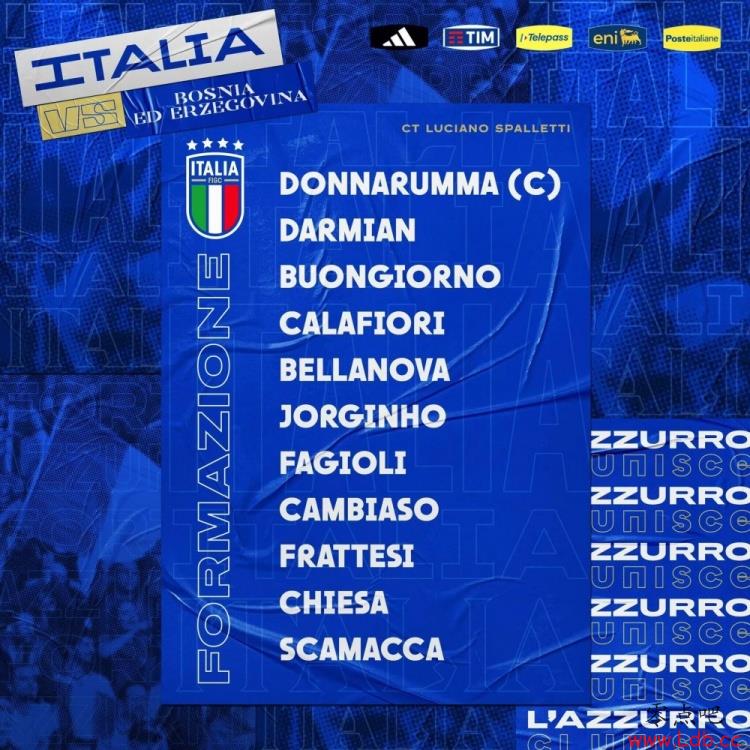 意大利首发:1-多纳鲁马、4-布翁乔尔诺、5-卡拉菲奥里、13-达米安、15-贝拉诺瓦、24-坎比亚索、7-弗拉泰西、8-若日尼奥、21-法乔利、9-斯卡马卡、14-基耶萨