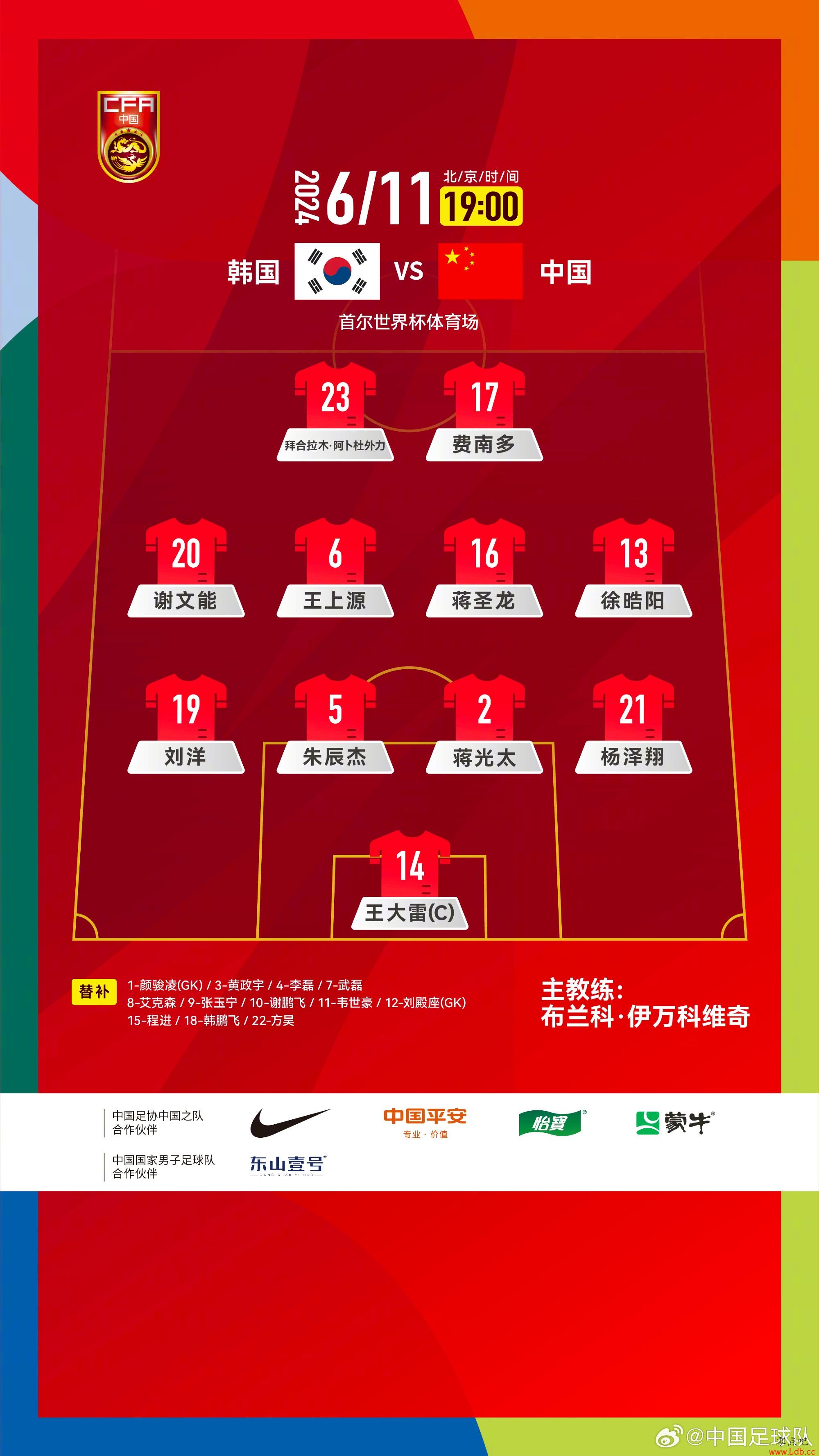 零点吧足球06月11日讯 男足世预赛亚洲区第二阶段C组第6轮,中国客场对阵韩国,赛前双方首发阵容出炉。中国足球队官方发布首发阵型图。