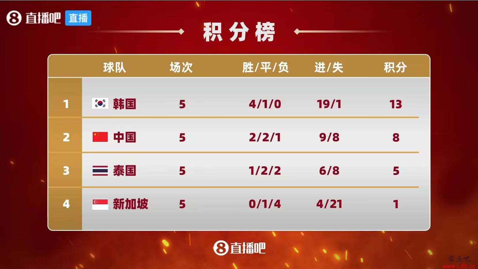 中国积8分,泰国积5分,中泰分差仍为3分,若末轮国足对韩国不败,或泰国不胜新加坡,国足即可晋级18强赛。