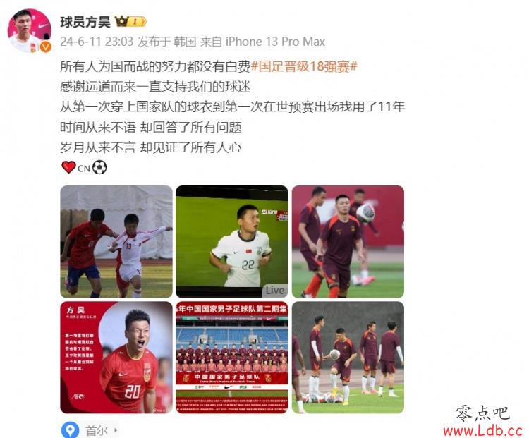 方昊在个人微博中写道:所有人为国而战的努力都没有白费,感谢远道而来一直支持我们的球迷。从第一次穿上国家队的球衣到第一次在世预赛出场我用了11年,时间从来不语,却回答了所有问题,岁月从来不言,却见证了所有人心。