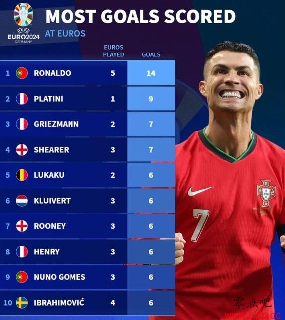 零点吧足球6月12日讯 欧洲杯开战在即,而历史射手王C罗有望在射手榜继续扩大自己的领先优势。