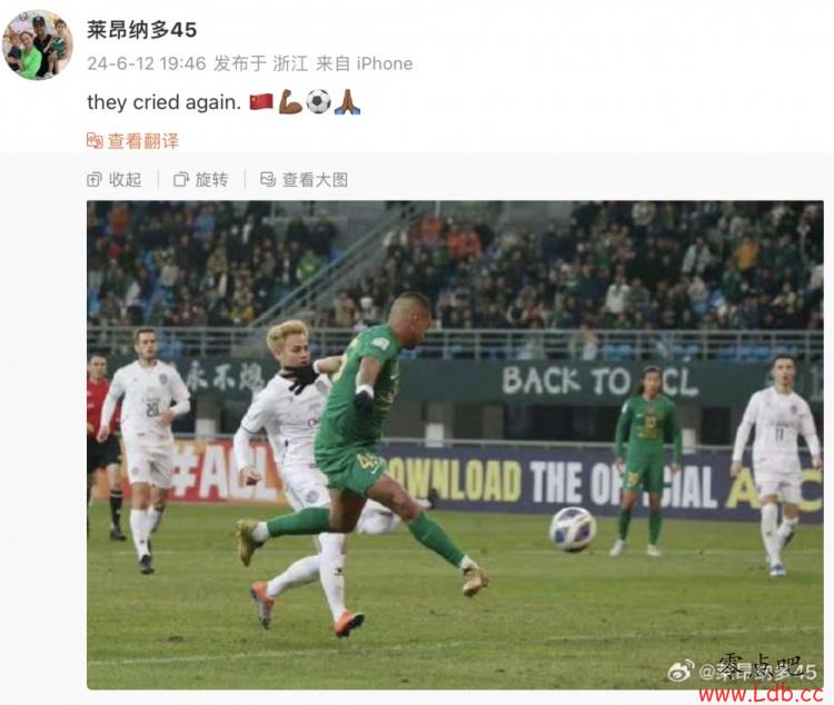 莱昂纳多在社媒晒出了亚冠赛场上浙江队主场3-2击败武里南联的照片,结合这次泰国队因为胜负关系的劣势,只能目送国足晋级18强赛,因此莱昂纳多配文写道:“他们又哭了。??????????????”