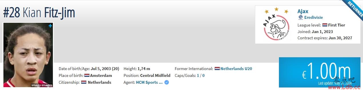 20岁的荷兰华裔球员菲慈占-天乐效力阿贾克斯青年队,司职中场,曾入选荷兰多级国字号球队。菲慈占-天乐的父亲来自苏里南,母亲来自中国香港。