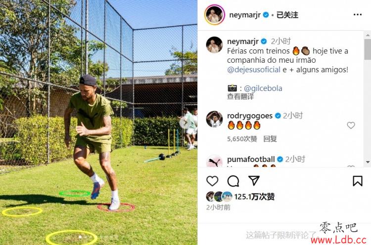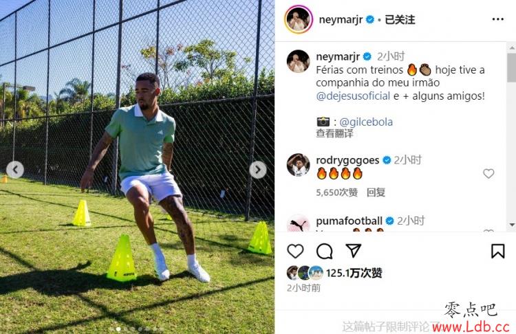 零点吧足球6月14日讯 内马尔更新社媒晒出了与同胞热苏斯一起训练的照片。