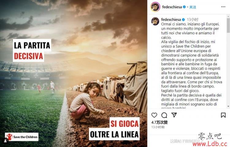 零点吧足球6月14日讯 意大利球星基耶萨日前在Instagram发文,呼吁保护儿童。