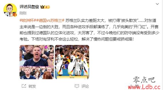 零点吧足球06月15日讯 欧洲杯揭幕战,A组东道主德国5-1横扫苏格兰,赛后著名评述员詹俊在微博发表比赛点评。