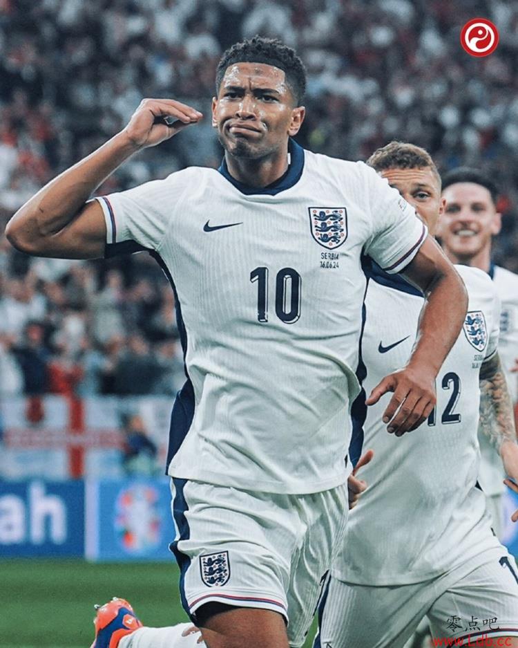 零点吧足球6月17日讯 英格兰vs塞尔维亚上半场,身披10号的贝林厄姆头球破门帮助英格兰领先!