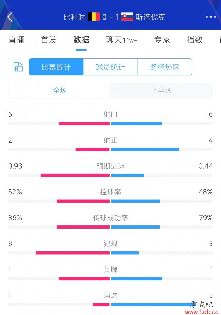比利时0-1斯洛伐克半场数据:射门6-6 预期进球0.93-0.44
