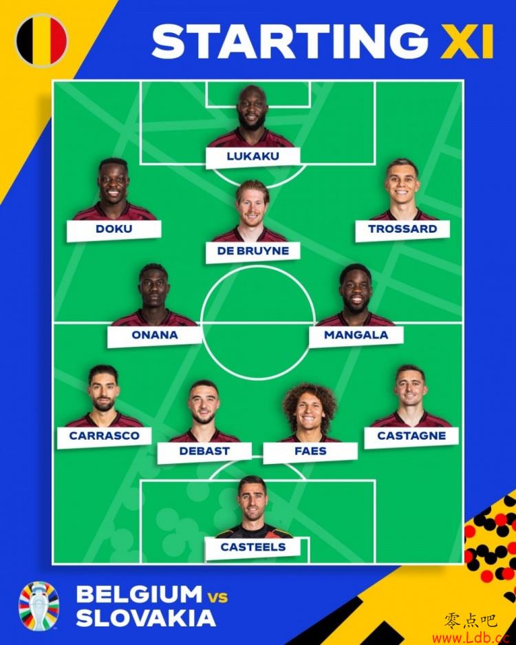 零点吧足球6月18日讯 欧洲杯小组赛E组第1轮,比利时对阵斯洛伐克,德布劳内、卢卡库先发出战。