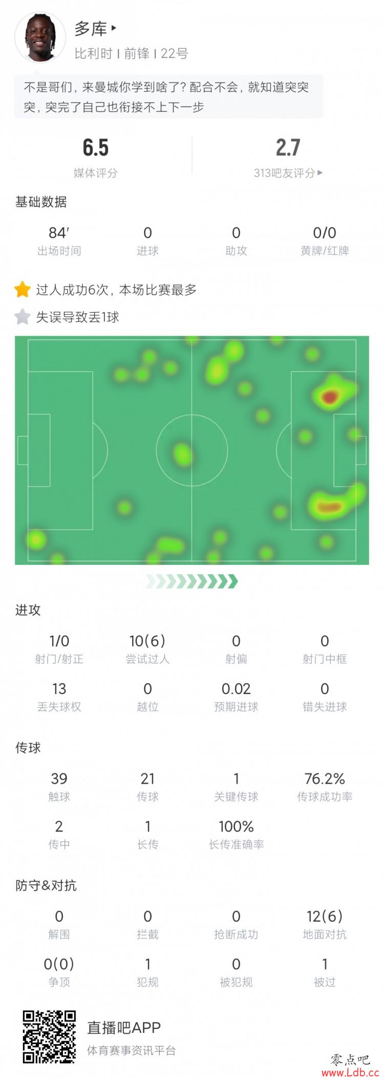 全场数据方面,多库1次射门,没有射正;10次过人6次成功,1次关键传球,12次第地面对抗6次成功,评分6.5分。