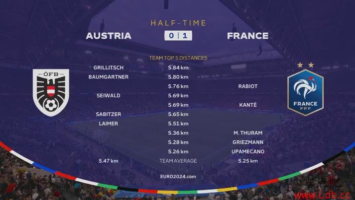 半场统计数据显示,奥地利平均跑动距离为5.47KM,法国平均跑动距离为5.25KM。格里利奇是半场跑动距离最多的球员,达到了5.84KM,法国跑动距离最多的是拉比奥特,他的跑动距离为5.76KM。