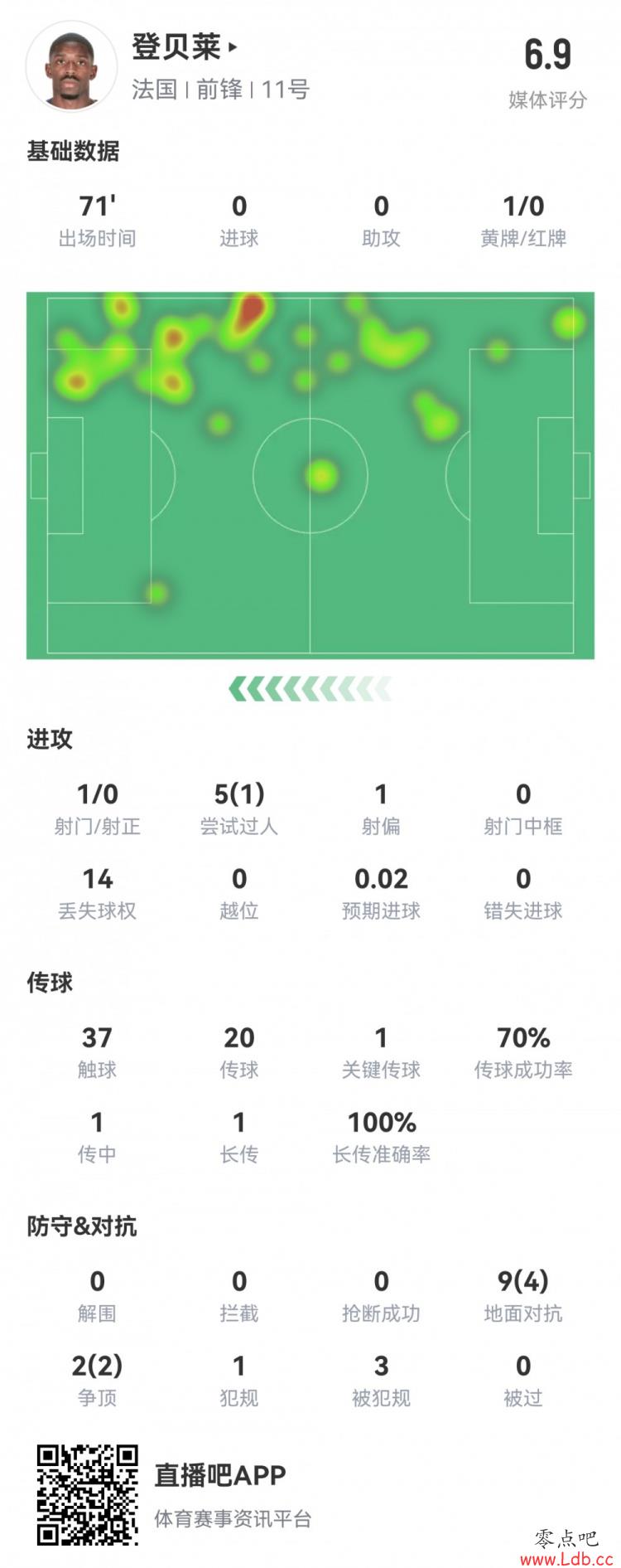 零点吧足球6月18日讯 正在进行的欧洲杯小组赛,法国1-0领先奥地利。此役登贝莱首发出场71分钟被换下,球员全场重点数据如下↓