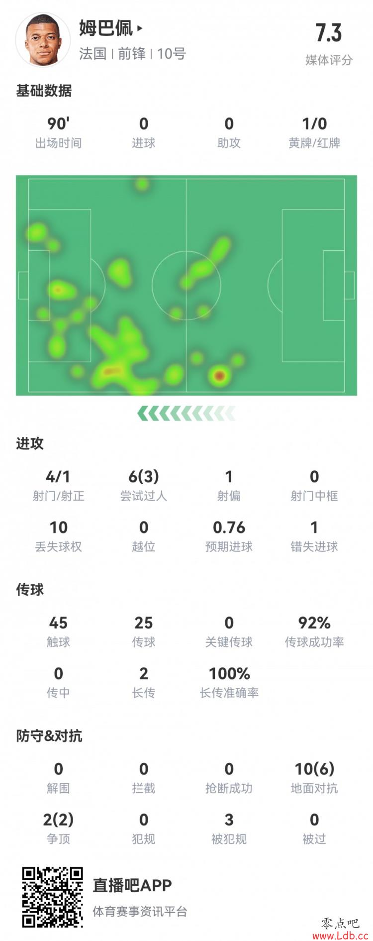 零点吧足球6月18日讯 正在进行的欧洲杯小组赛,法国1-0领先奥地利。此役姆巴佩首发90分钟造乌龙后伤退,球员全场重点数据如下↓