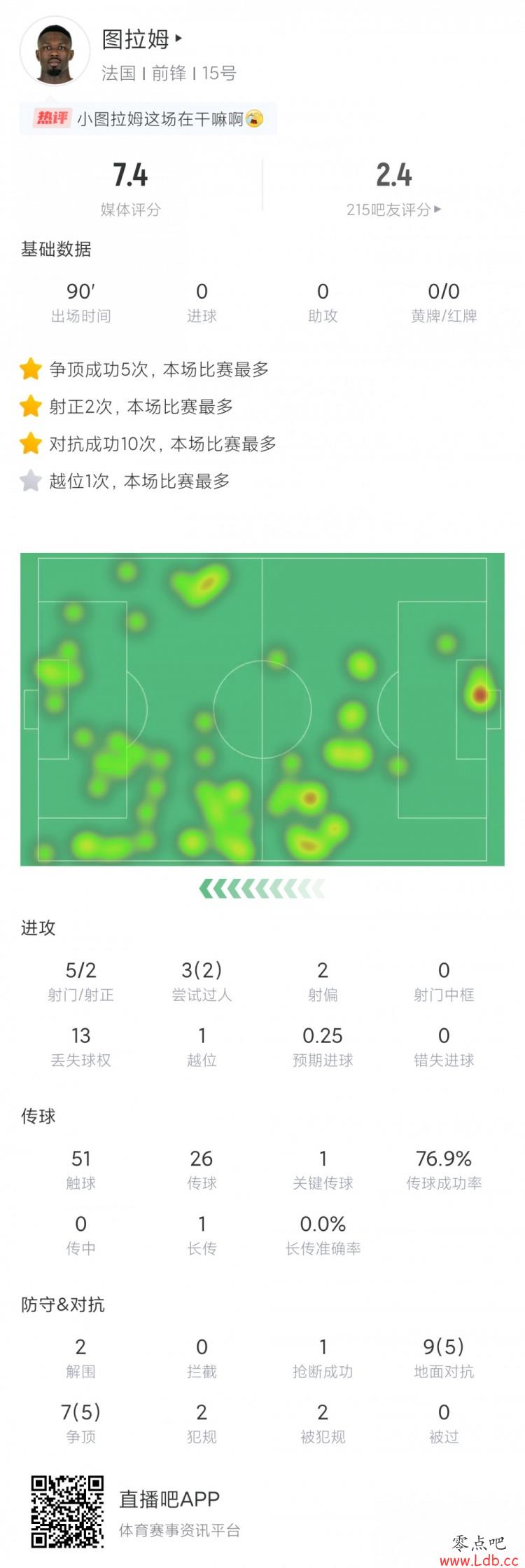 数据方面,小图拉姆5脚射门,2脚射正,3次过人2次成功,送出一次关键传球;2解围1抢断,9次地面对抗5次成功,7次空中对抗5次成功,评分7.4分。