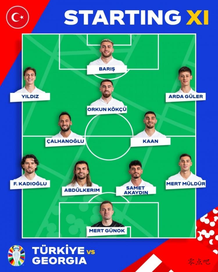 零点吧足球6月18日讯 北京时间6月19日00:00,欧洲杯小组赛F组第1轮,土耳其对阵格鲁吉亚,19岁114天的居勒尔和19岁45天的伊尔迪兹为土耳其先发出战。
