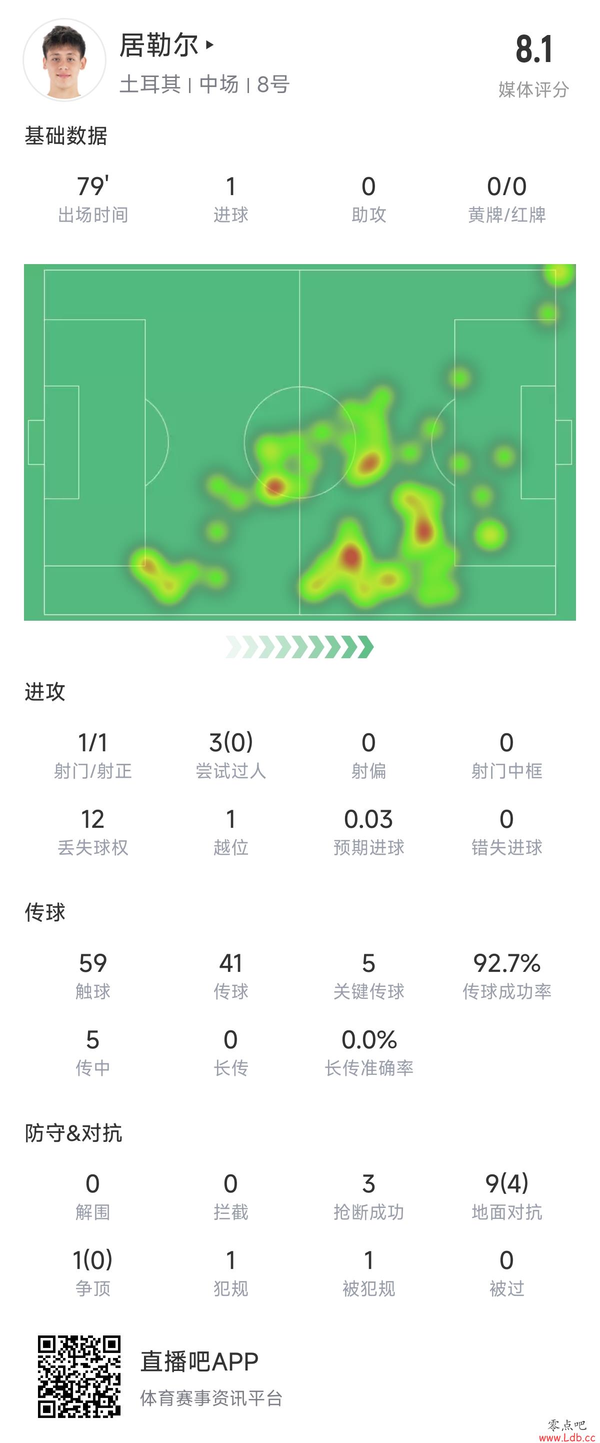 居勒尔全场数据:1次射门打入1球,传球成功率92.7%+5次关键传球