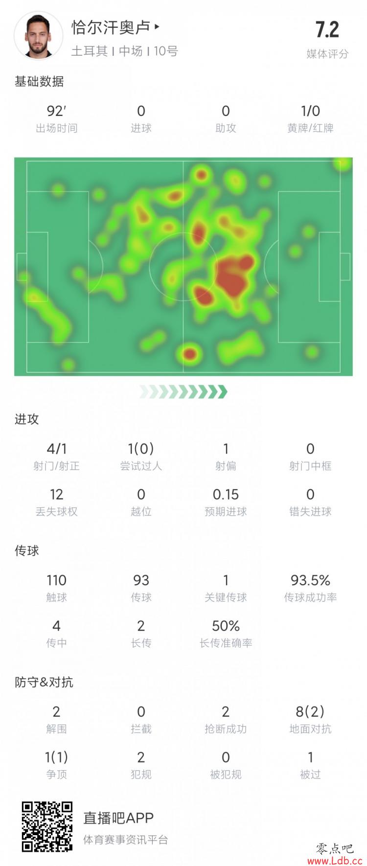 数据方面,恰尔汗奥卢4射1正,送出1次关键传球,防守方面2解围2抢断,评分7.2分。