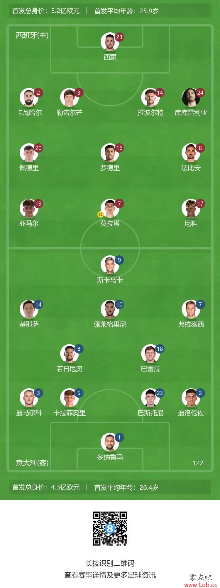 ??焦点大战!西班牙vs意大利首发身价对比:5.2亿欧vs4.3亿欧