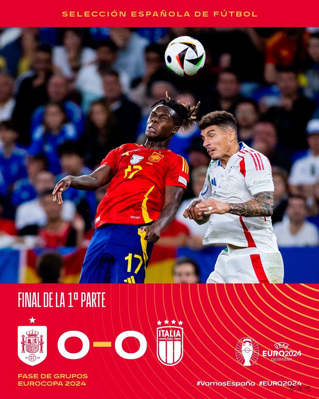 零点吧足球6月21日讯 欧洲杯小组赛B组第2轮,西班牙半场0-0意大利。