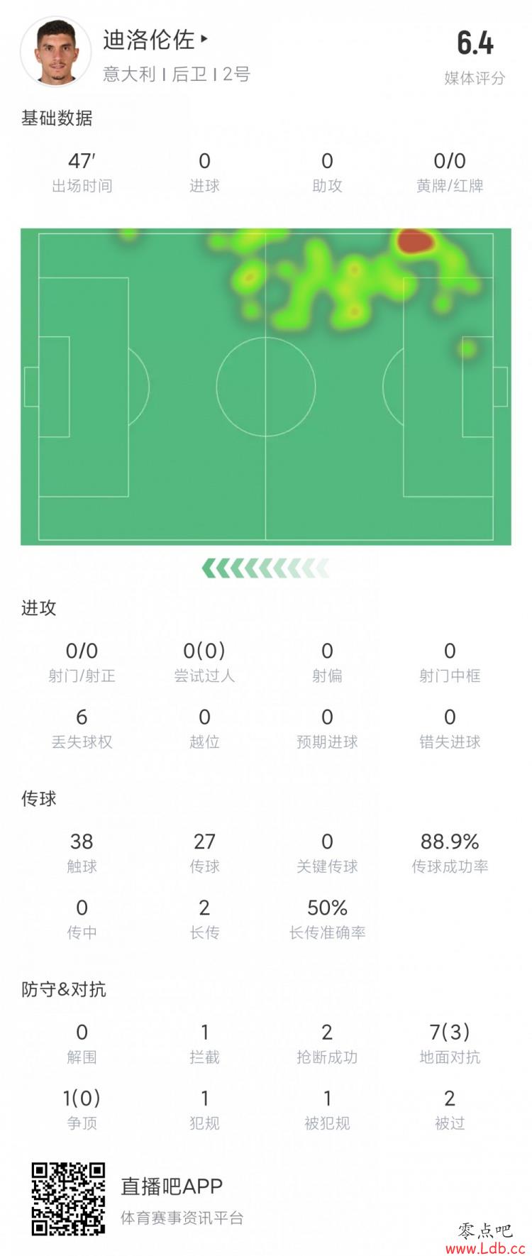 数据方面,迪洛伦佐2次被过,1次犯规,7次地面对抗3次成功,1次空中对抗0次成功;有过1次拦截和2次抢断,评分暂6.4分全场最低。