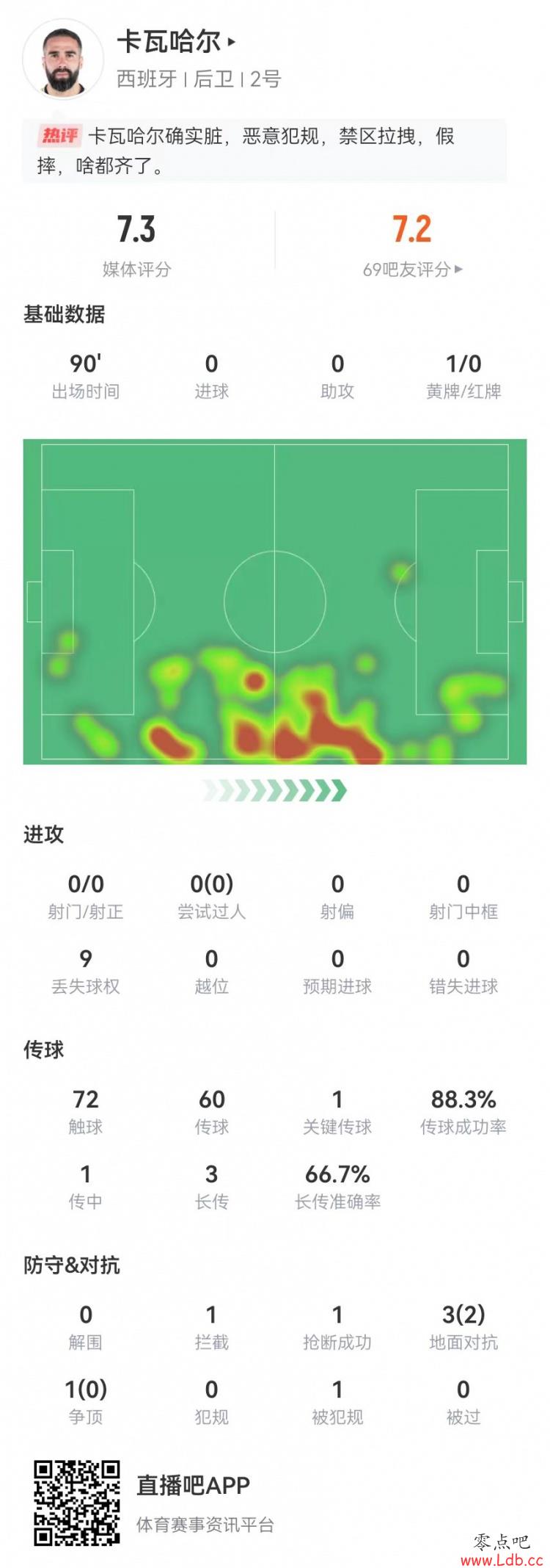 零点吧足球6月21日讯 西班牙在本轮欧洲杯1-0力克意大利,卡瓦哈尔本场数据如下: