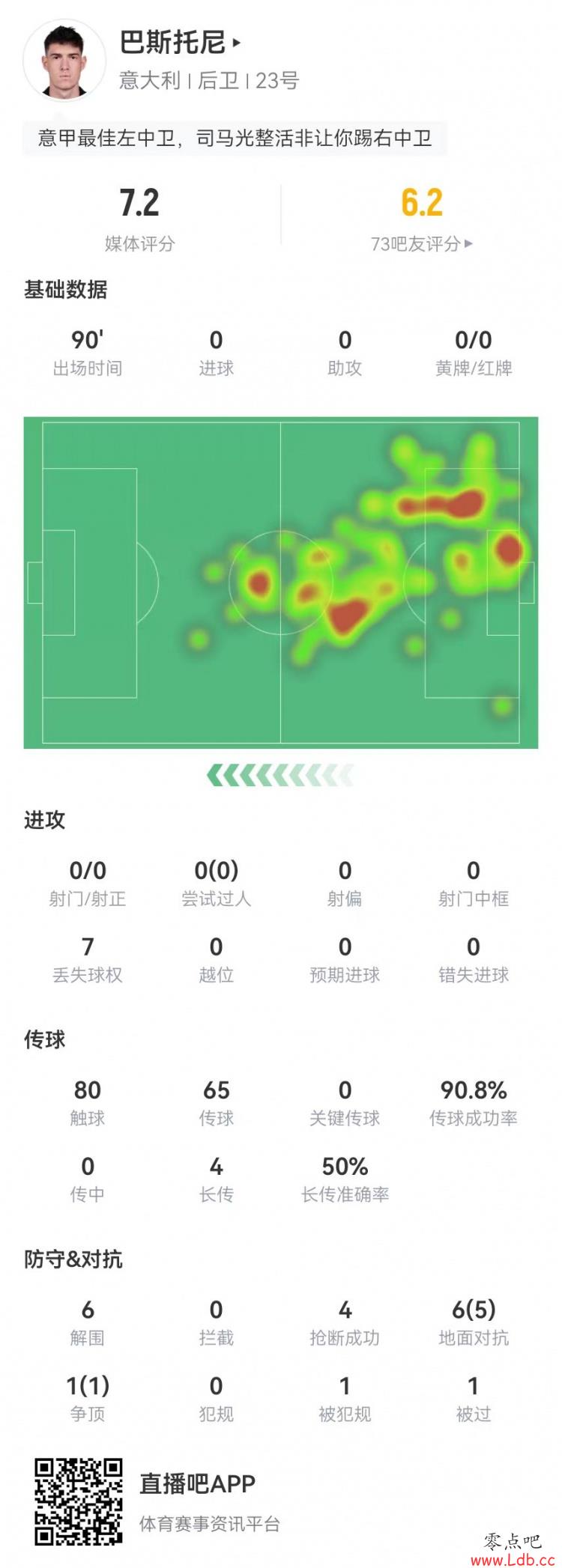 零点吧足球6月21日讯 意大利在本轮欧洲杯0-1不敌西班牙,出任右中卫的巴斯托尼本场数据如下:
