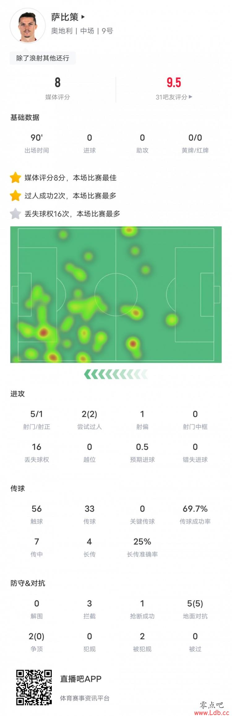 零点吧足球6月22日讯 欧洲杯小组赛,奥地利3-1战胜波兰。此役奥地利中场萨比策首发踢满全场。