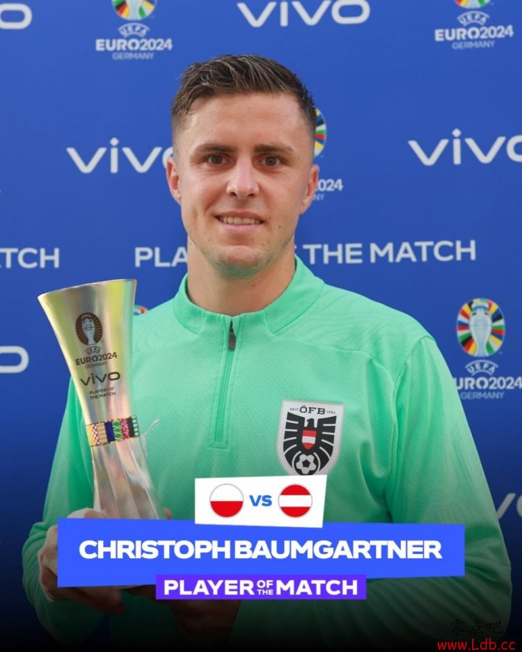 零点吧足球6月22日讯 欧洲杯小组赛D组第2轮,奥地利3-1击败波兰,打进一球的鲍姆加特纳当选全场最佳球员。