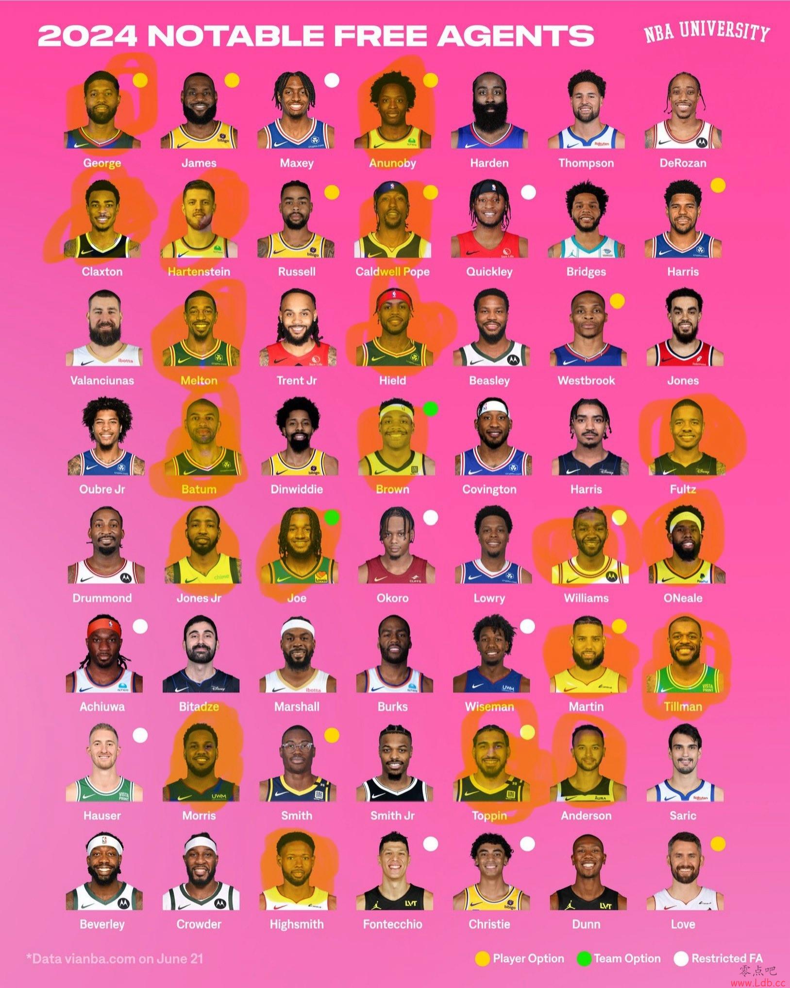 休赛期自由球员,黄点为球员选项,绿点为球队选项