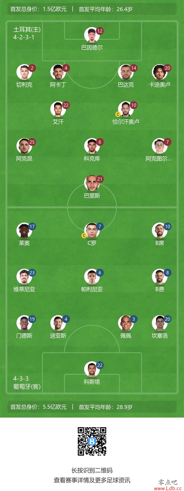 零点吧足球06月22日讯 北京时间6月23日0:00,欧洲杯小组赛F组第2轮,土耳其vs葡萄牙的比赛将在多特蒙德主场(伊杜纳信号公园球场)打响,赛前双方公布首发阵容。