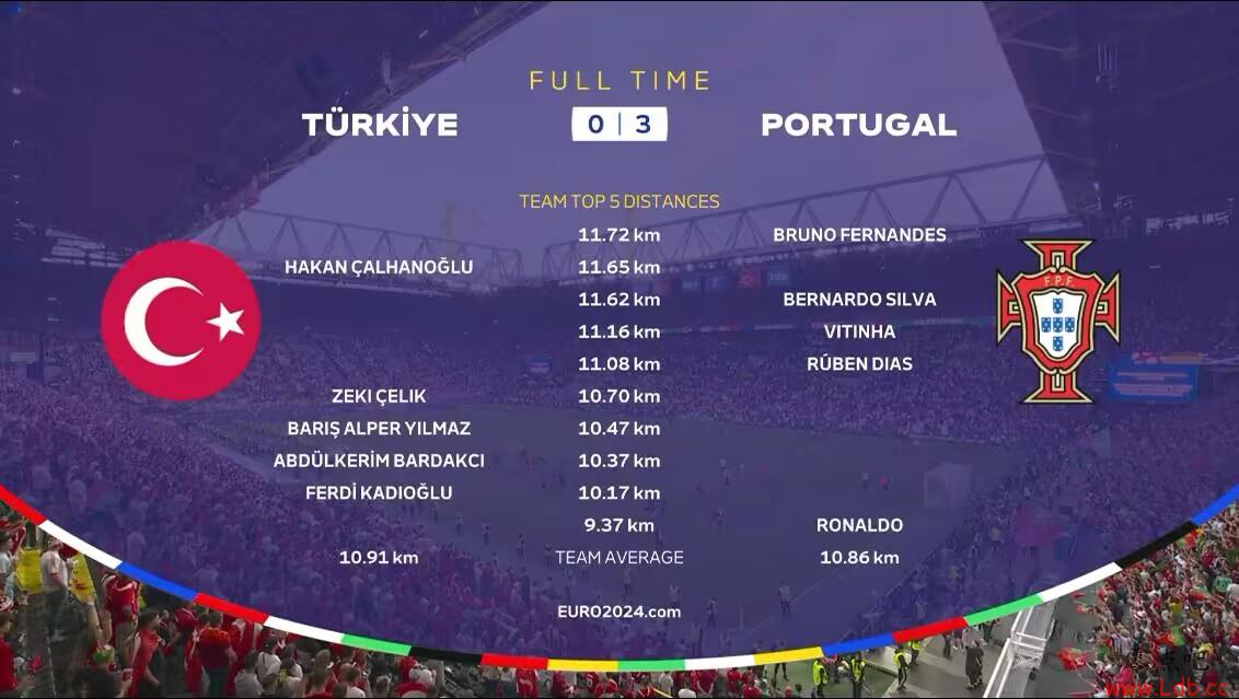 土耳其人均跑动10.91公里,葡萄牙人均则是10.86公里。