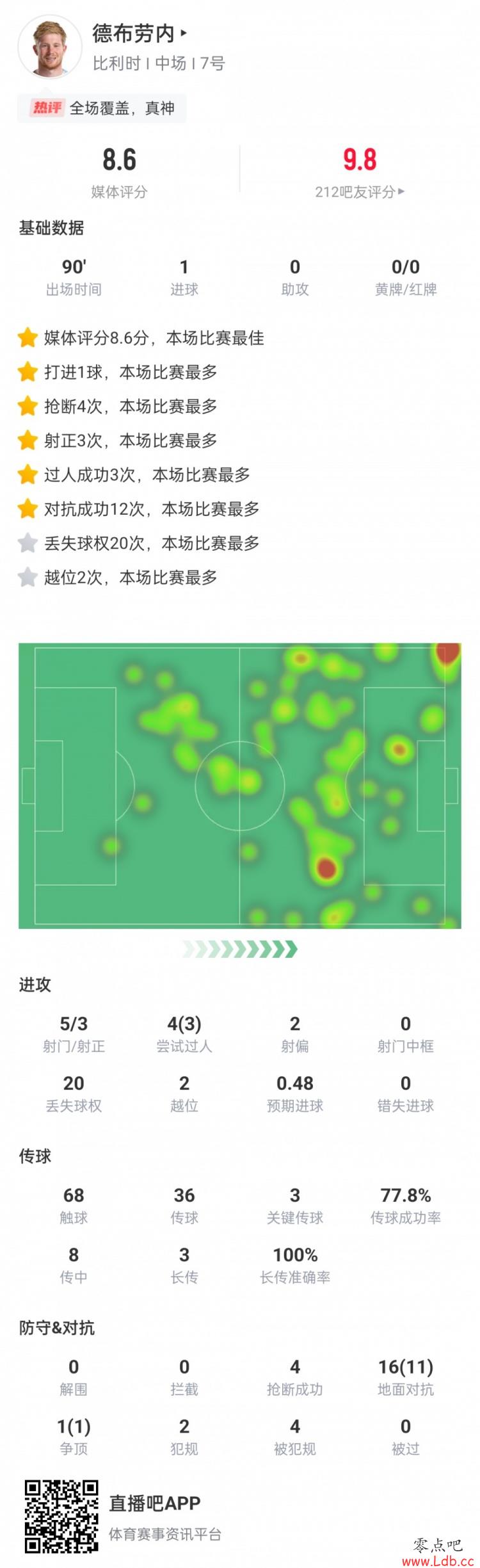 德布劳内数据:3射正打进1球,3关键传球,4抢断,8.6分全场最高