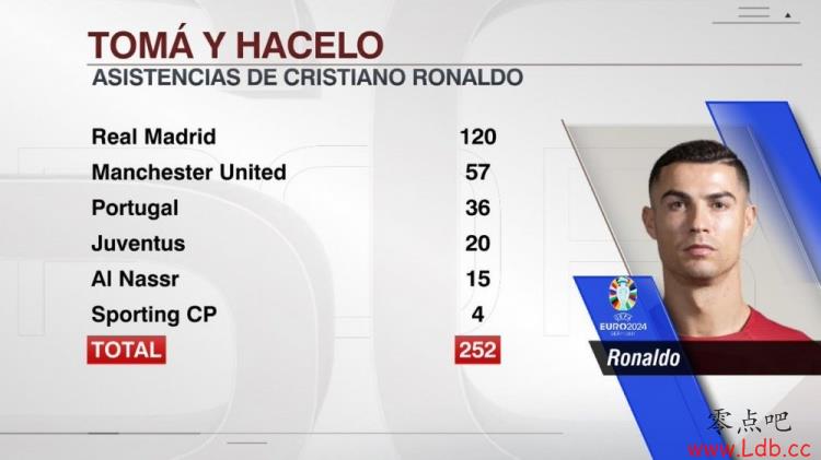 零点吧足球6月23日讯 在欧洲杯小组赛第二轮比赛中,C罗送出助攻,帮助葡萄牙3-0完胜土耳其。据ESPN统计,C罗职业生涯至今已经送出252记助攻。