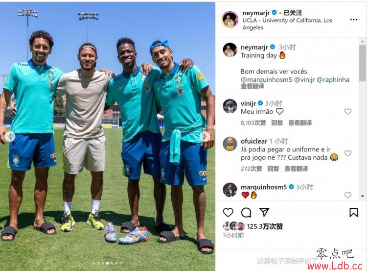 零点吧足球6月23日讯 巴西球星内马尔更新社媒动态,晒出与维尼修斯等巴西国脚的合照。