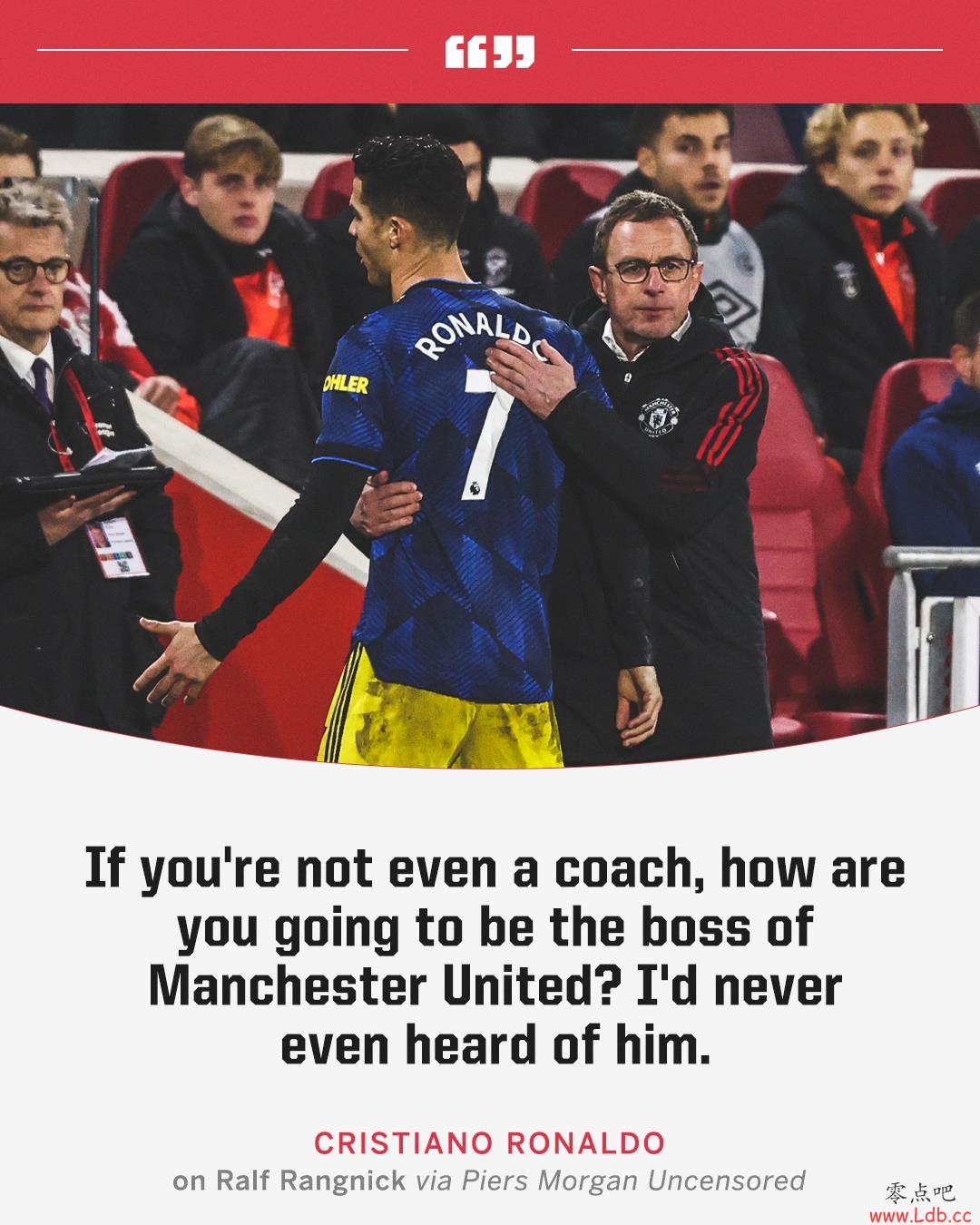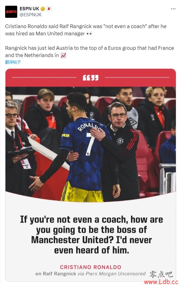 ESPN对此表示:C罗表示,在朗尼克被聘请为曼联主帅后,他“甚至不算一名教练”。朗尼克刚刚率领奥地利夺得欧洲杯小组第一,小组对手包括法国和荷兰。