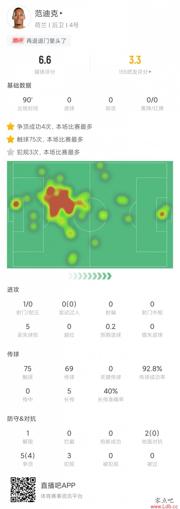 数据方面,范迪克本场1次解围,0拦截,0抢断;2次地面对抗均未成功,5次空中对抗4次成功,3次犯规。评分6.6分,