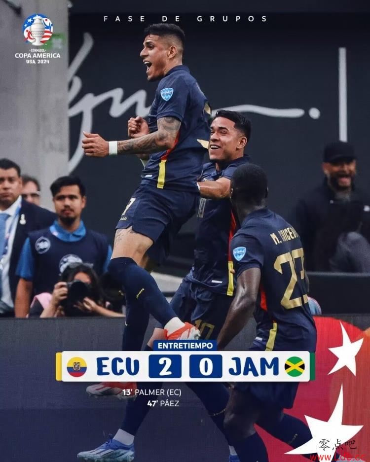 零点吧足球6月27日讯 北京时间6月27日06:00,美洲杯小组赛B组第二轮厄瓜多尔迎战牙买加的比赛,上半场派斯开场失良机,凯塞多助攻因卡皮耶传中破门,托雷斯造点,派斯点射扩大比分,半场结束,厄瓜多尔2-0牙买加。