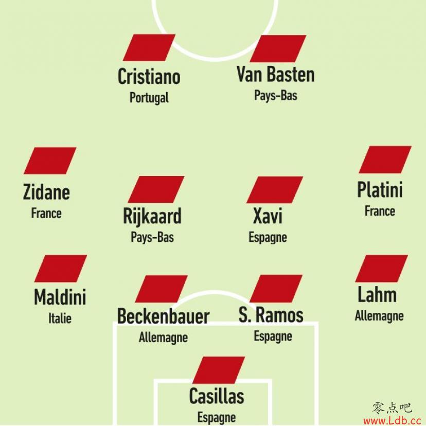 零点吧足球06月27日讯 欧洲杯开赛前,队报用户对过去16届欧洲杯进行投票,选出了最强阵容。