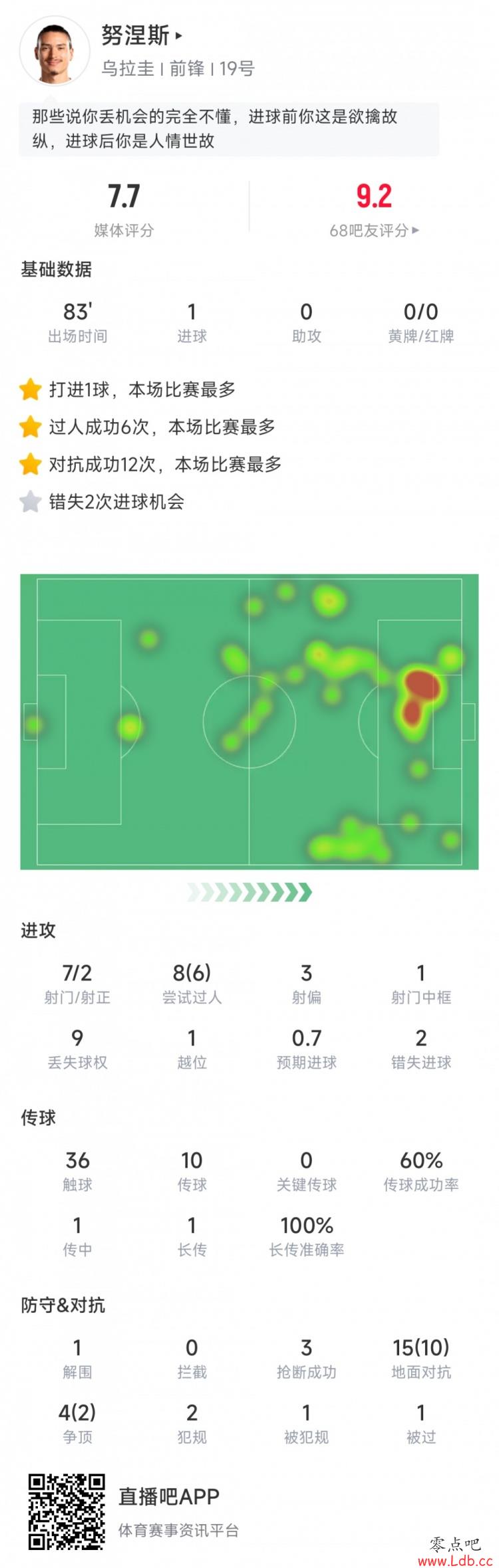 努涅斯本场数据:7次射门打进1球,8次过人6次成功&错失2次机会