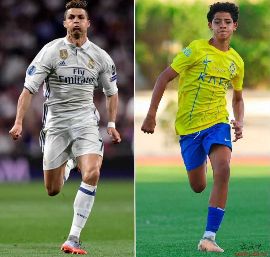 而足坛这边,39岁C罗的儿子迷你罗不久前刚过完14岁生日,迷你罗目前效力于利雅得胜利梯队。在今年2月还随队拿到了U13联赛冠军。在球队里,他与父亲一样身披7号球衣。