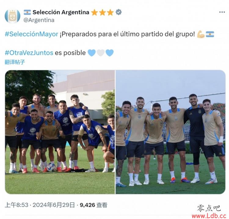 北京时间明天上午8点,阿根廷将在美洲杯最后一轮小组赛中对阵秘鲁。阿根廷队官方账号在社交媒体上晒出球员们训练中的合照,并写道:“为最后一场小组赛做好准备!”
