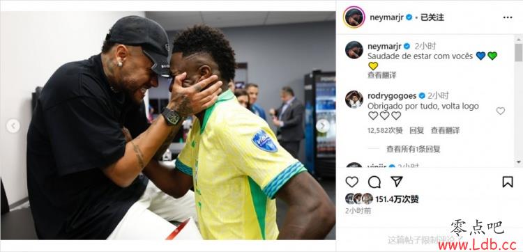 赛后内马尔更新社媒,晒出自己造访巴西更衣室鼓励球员们的照片,并配文:我想念和你们在一起的时光??????