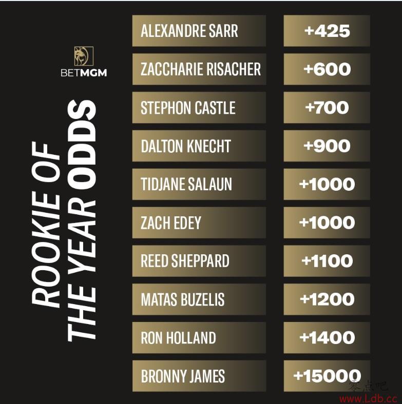 零点吧06月30日讯 2024年NBA选秀大会正式结束,博彩网站也更新了24-25赛季最佳新秀的赔率: