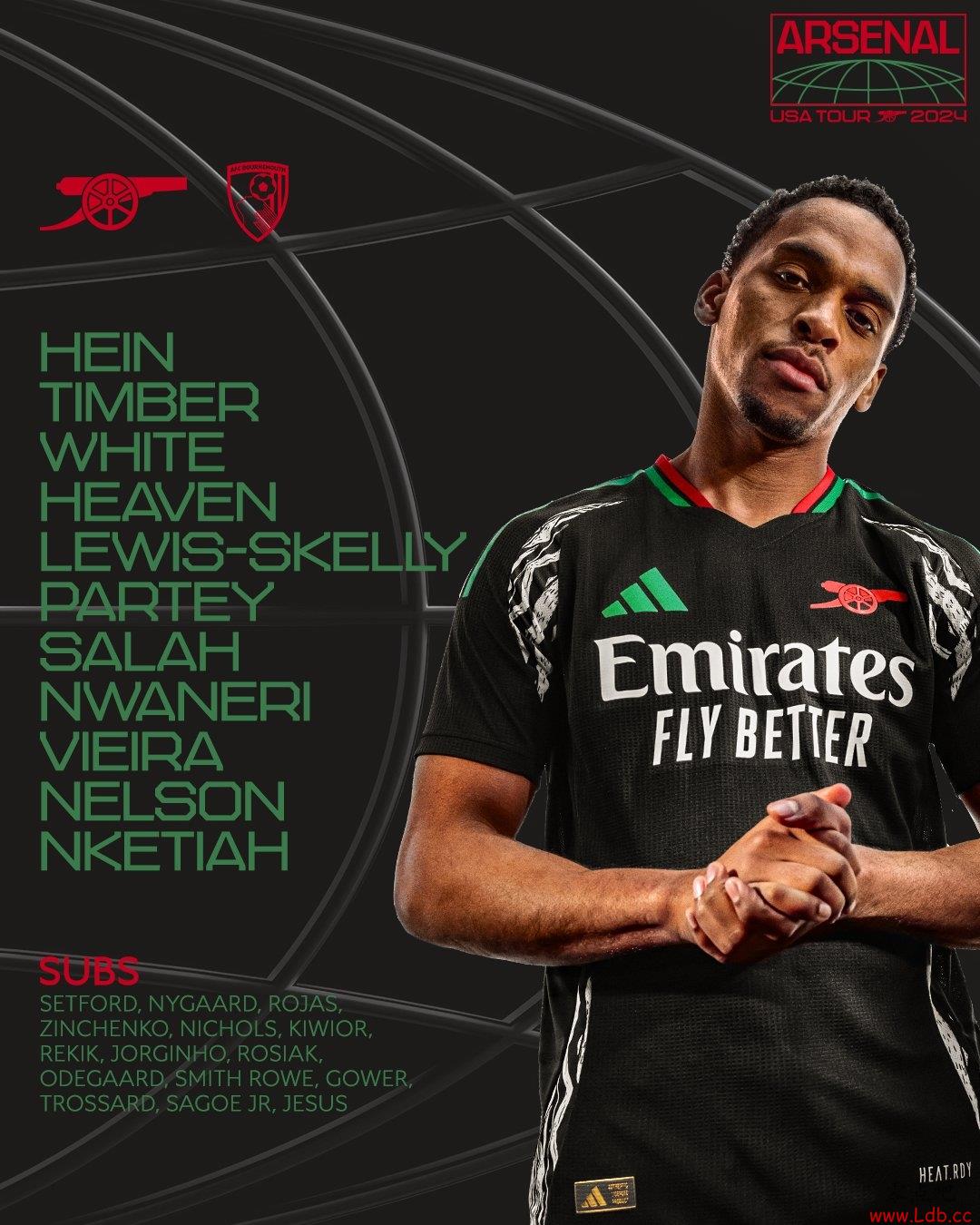 热身赛-阿森纳vs伯恩茅斯首发:廷伯、恩凯提亚先发,热苏斯替补