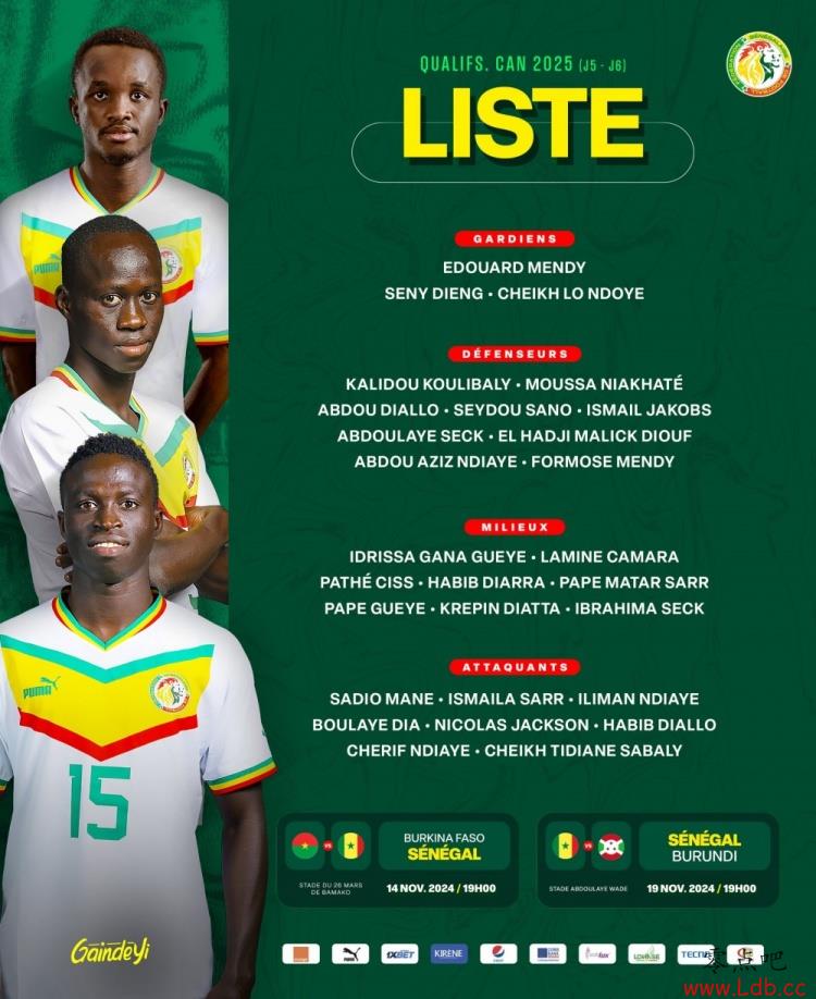 11月非洲杯预选赛小组赛,塞内加尔15日3时客战布基纳法索,20日3时主场对阵布隆迪。