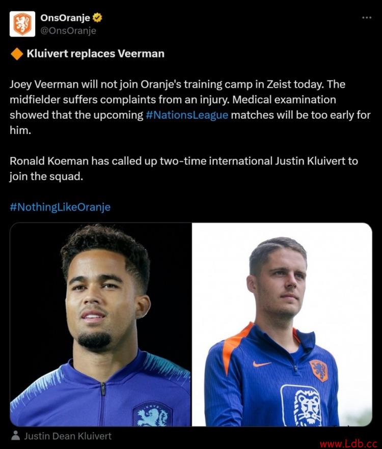 此外,主帅科曼已经补召伯恩茅斯边锋小克鲁伊维特加入国家队。
