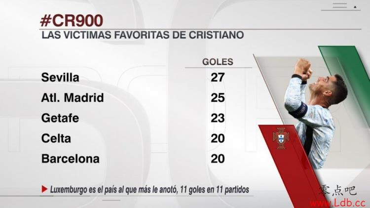 C罗职业生涯对阵不同球队进球数量排名: