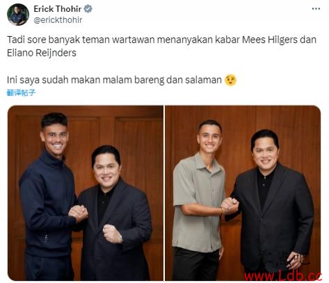 印尼足协主席表示:今天下午很多记者朋友询问Mees Hilgers(米斯-希尔格斯)和Eliano Reijnders(埃利亚诺-赖因德斯)情况,我和他们吃了晚饭并握手。