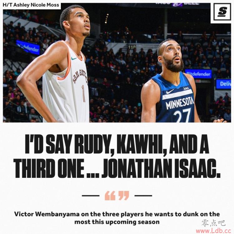 当被问及新赛季最想隔扣的对象时说,文班亚马表示一定得是非常厉害的防守球员,这样才有价值,他表示:“(隔扣)最好的防守者将是最大的挑战,所以当然有我的好大哥(鲁迪)戈贝尔,还有莱昂纳德会是一大挑战——因为我非常尊重这些人在防守端的表现,在他们身上扣篮会是非常棒的。”