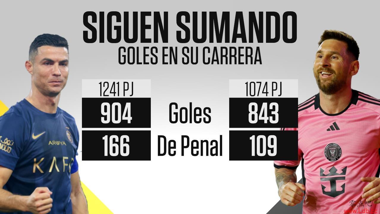 还在输出!梅西生涯1074场打进843球,C罗1241场打进904球